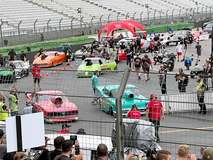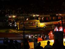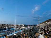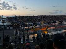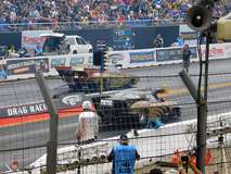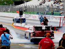 Nos places sont juste devant la ligne de départ. Nous voyons non seulement les dragsters faire tourner leurs moteurs au départ, mais aussi les véhicules suivants qui se préparent à prendre le départ dans la Burnoutarea.